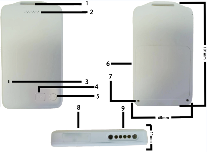 1. 掛繩口 2. 語音播報孔 3. 工作指示燈 4. 報警按鍵 5. 開關(guān)機按鍵 6. 銘牌