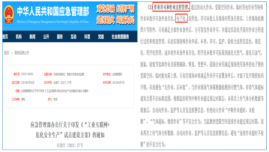 2021年4月7日,應(yīng)急管理部辦公廳發(fā)布印發(fā)《“工業(yè)互聯(lián)網(wǎng)+危化安全生產(chǎn)”試點建設(shè)方案》的通知,方案對作業(yè)許可和作業(yè)過程管理作出了明確指示,要求特殊作業(yè)審批許可條件條目化、電子化、流程化等。