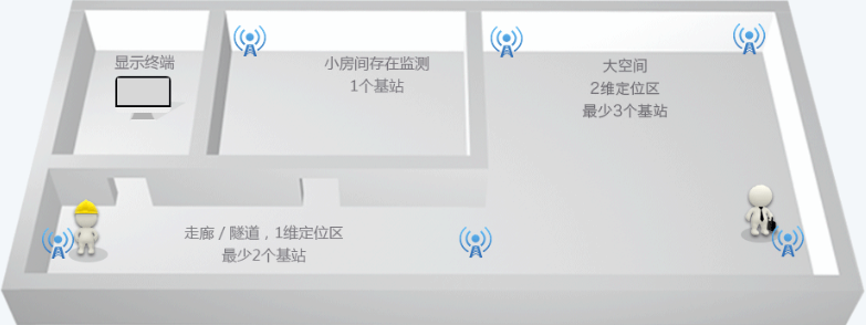 二維定位: 系統在平面區域邊沿架設基站,遇到柱子、墻壁等阻擋源需要增加基站,并為基站供電供網。
