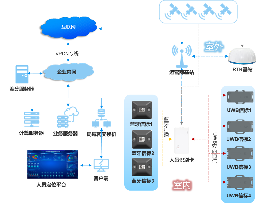 藍牙+UWB+GPS/北斗RTK人員定位系統拓撲圖如下: